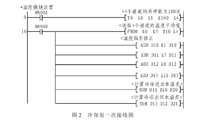 若冷却水进水出水表现为温差大,则表示冷冻机负荷大,冷却水需要完成交换的热量较大,因此,需要通过提升冷却泵的转速以及冷却水的循环量来实现。反之,则表示冷冻机负荷小,应该降低冷却泵的转速以及循环量,从而有效节约电能。其中采用西门子S7-226控制器冷冻水出回水和冷却水进出水的温度检测及温差计算程序如图2所示。
