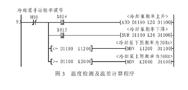 结合上述计算获得的冷冻水出回水温差和冷却水进出水温差,进行冷冻泵和冷却泵变频器的自动调节控制,根据GB/T18430.1等标准设定:若温差表现为变小,则需要降低运行频率,且不能低于30Hz,若温差表现为变大,则需要提升运行频率,且不能超过50Hz,进而实现恒温差的监测调控,使得变频器的运行节能性能最大。而本文对冷却泵的手动调速PLC程序如图3所示。其中设定了冷却泵频率上升和冷却泵频率下降,和冷却泵下限频率和冷却泵上限频率的设定。