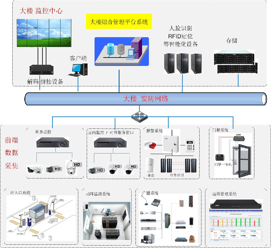 依托数字电子技术与计算机控制系统,建设一套具有总体把控法院/检察院大楼的安防监控、周界防护、一卡通、报警联动、语音对讲、广播、拜访人员定位、人脸识别、出入口车辆管理和停车场管理等功能的智能化应用系统,实现事前防范、事中管理、事后追溯的智能化应用;系统采用模块化管理,各个子模块系统(如监控系统、报警系统、一卡通系统、人脸识别应用系统、停车场系统、广播系统、云存储系统、系统运维系统)可以独立部署和独立运行。