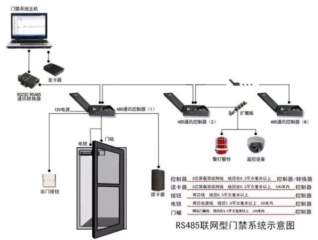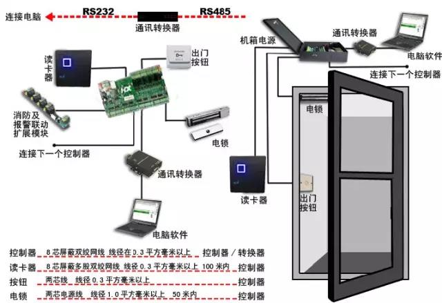 读卡器到控制器的线,建议用8芯屏蔽多股双绞网线(其中三芯备用,如果不需要读卡器声光反馈合法卡可不接LED线),数据线Data1Data0互为双绞。线径建议0.3平方毫米以上。建议最长不超过100米。屏蔽线接控制器的GND。按钮到控制器的线,建议采用两芯线,线径在0.3平方毫米以上。